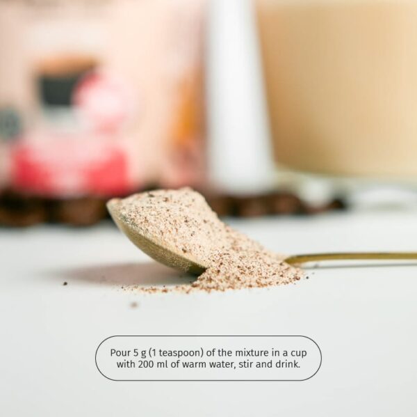 Versez 200 ml d’eau tiède sur 5 g (1 càc) de mélange dans une tasse, remuez et buvez.