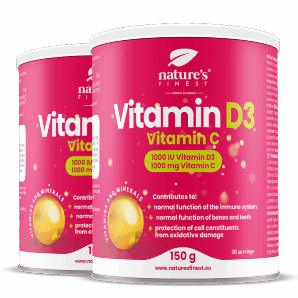 Vitamine D3 + Vitamine C en poudre garantit une meilleure absorption, qui commence dès que les vitamines entrent en contact avec la salive. Le rôle principal de la vitamine D est de maintenir l’homéostasie et une concentration constante de calcium et de phosphate dans le plasma, et la vitamine C agit comme un puissant antioxydant.